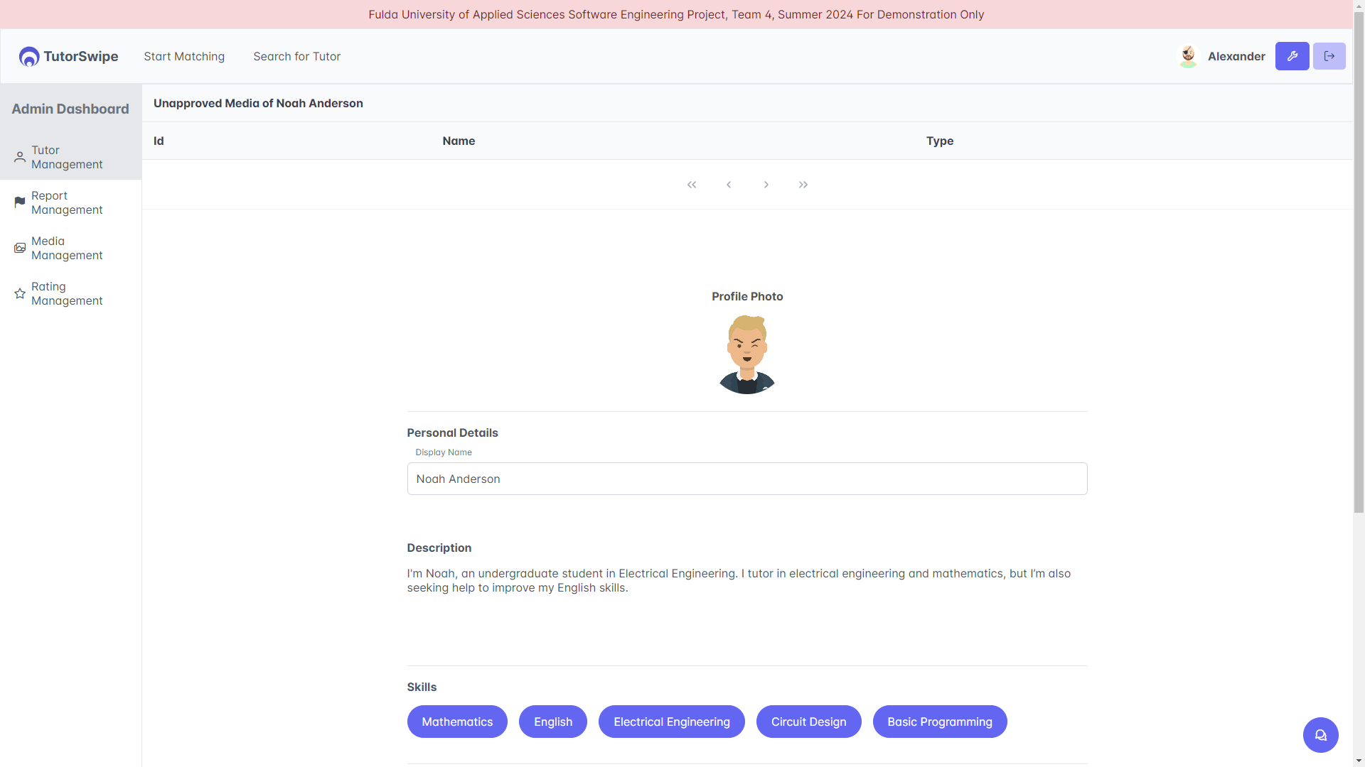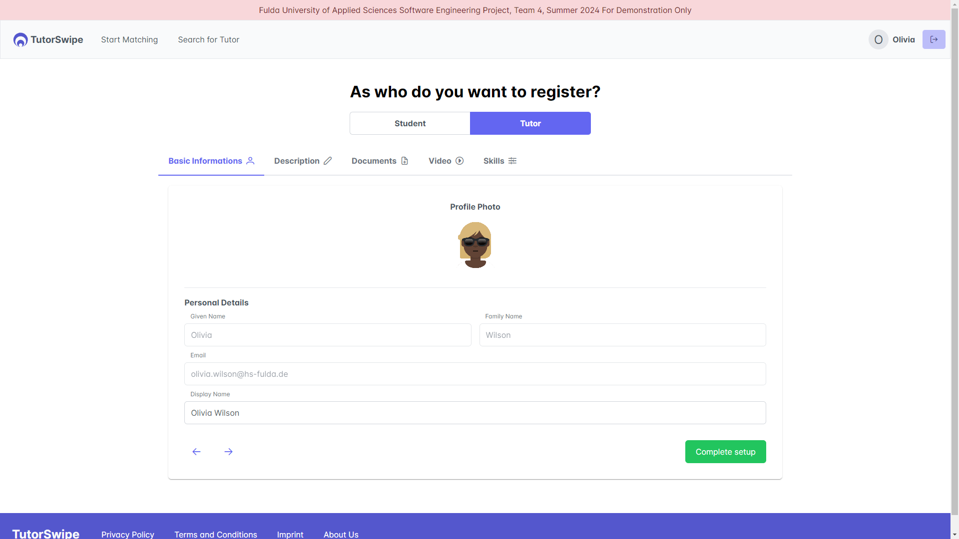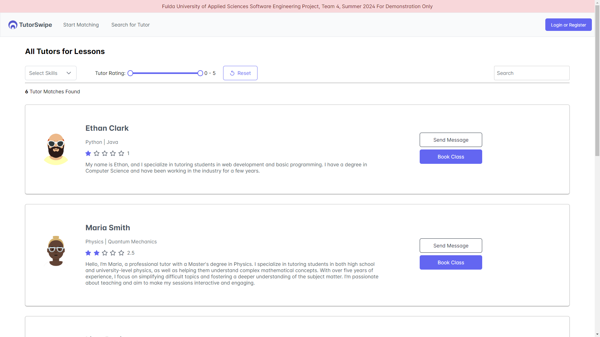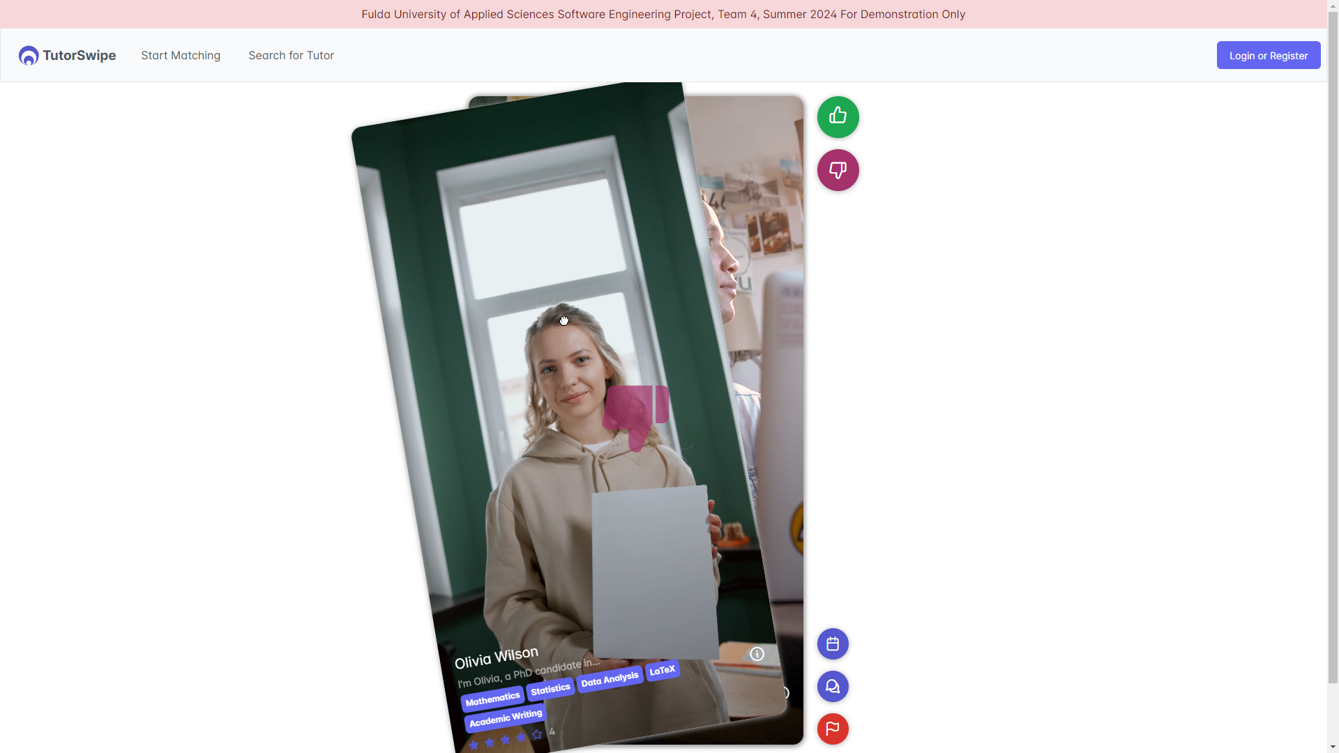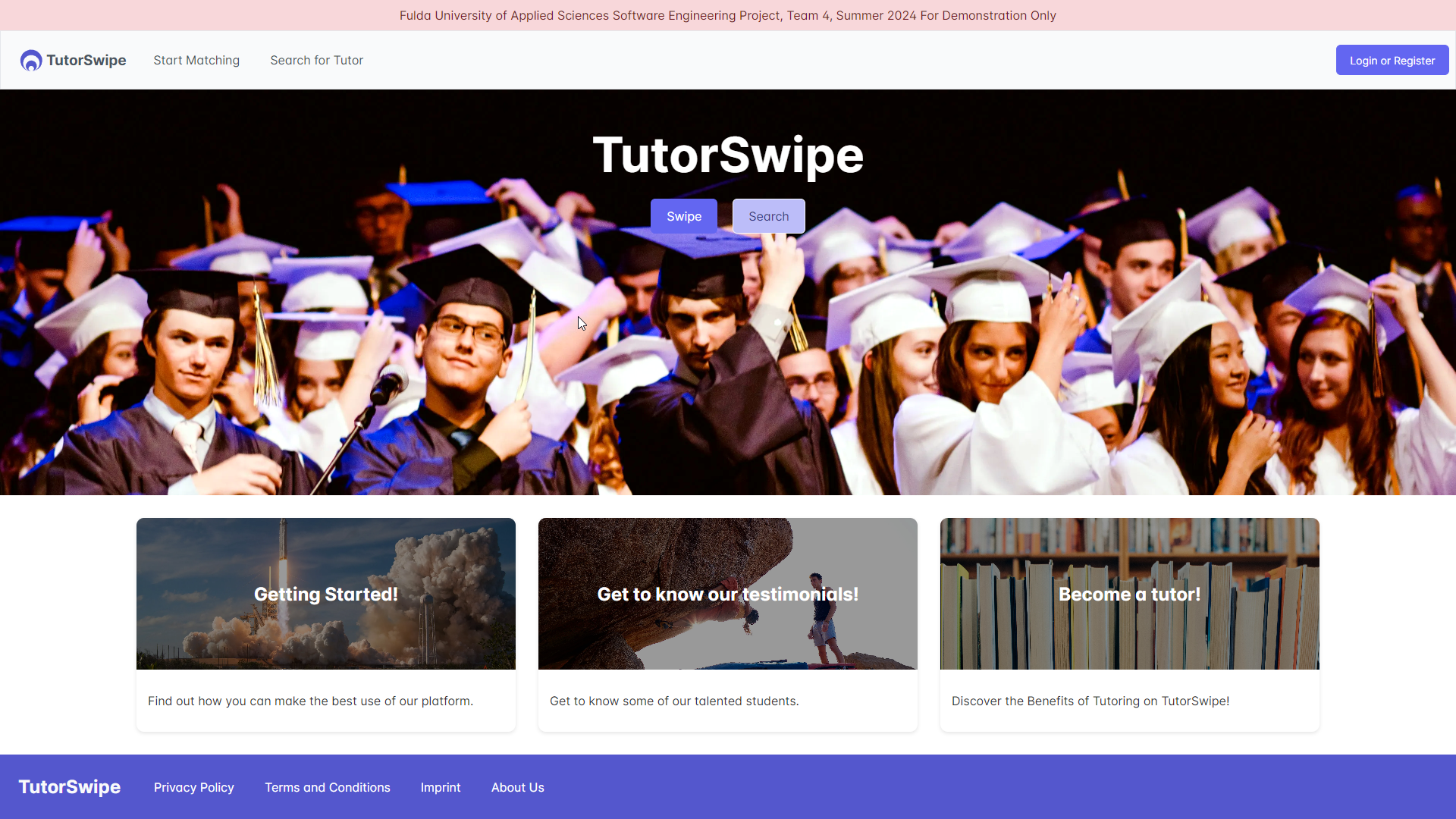 TutorSwipe is a team-based university project that focuses on connecting students with suitable tutors in a structured and secure learning environment. Developed by a six-person team, the platform enables users to discover tutors, manage profiles, book sessions, communicate via integrated messaging, and handle payments. A key feature is the video-based swipe mechanism, which allows students to explore tutor profiles in an intuitive and engaging way.